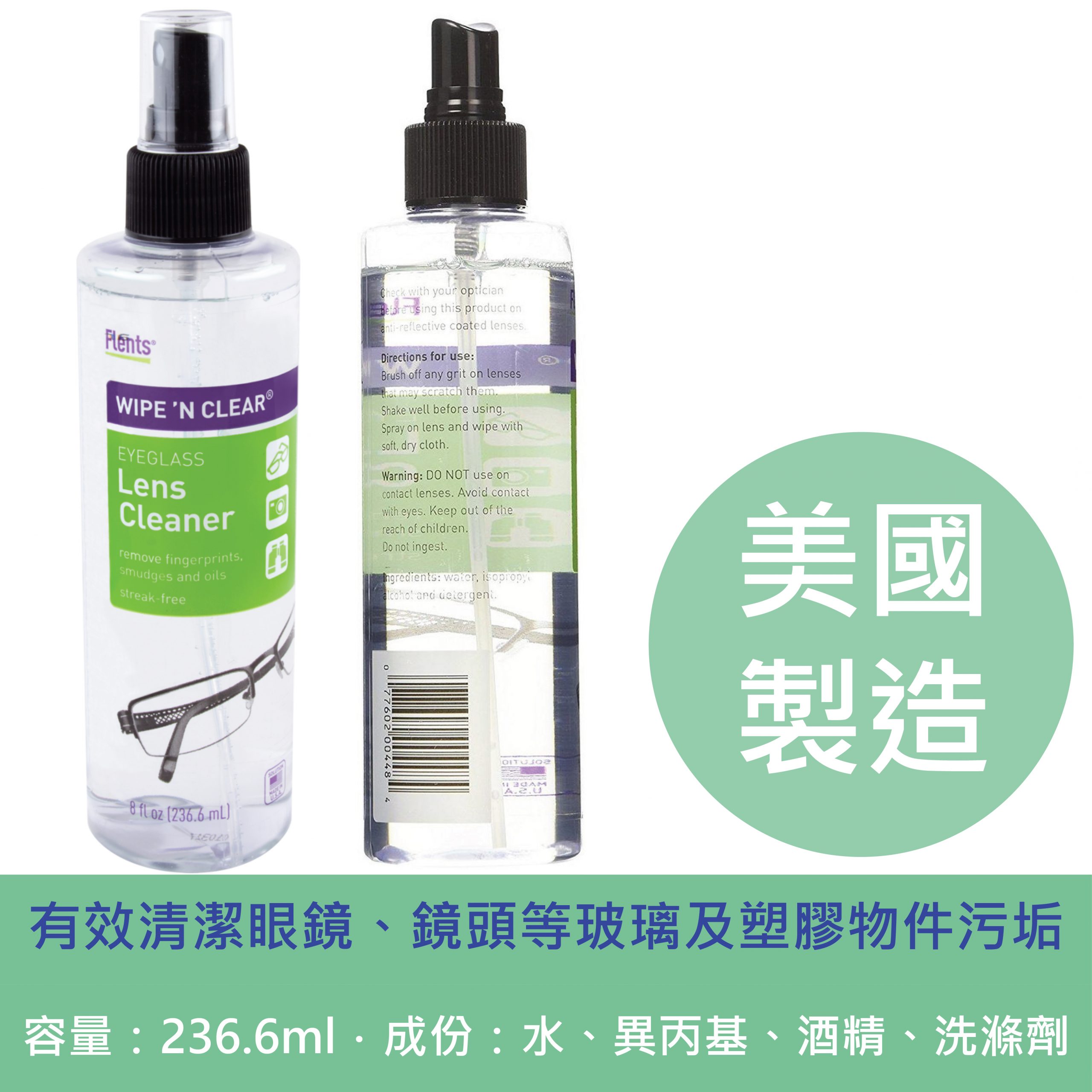 容量為236.6毫升(8盎司),尺寸為直徑5厘米 x 高21厘米。主要成分包括水、異丙基酒精和洗滌劑,確保清潔效果卓越且安全。